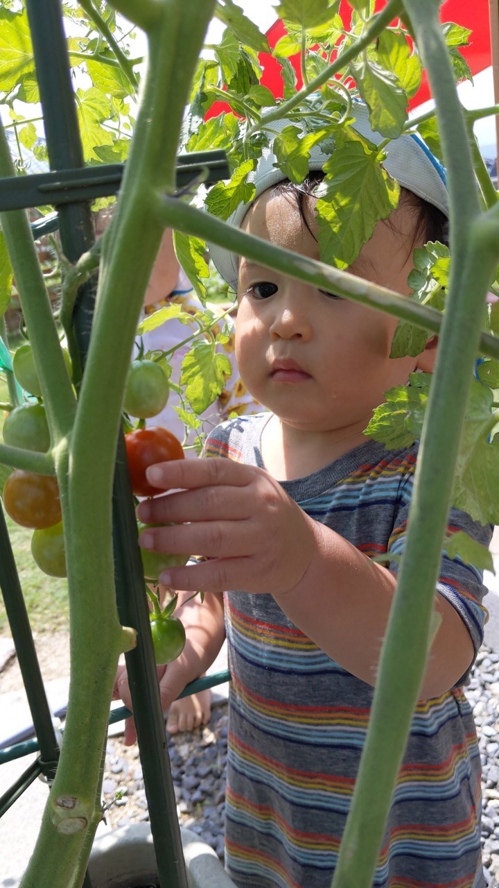 みんなで育てたトマト。まっ赤になったからたーべよ!! |
