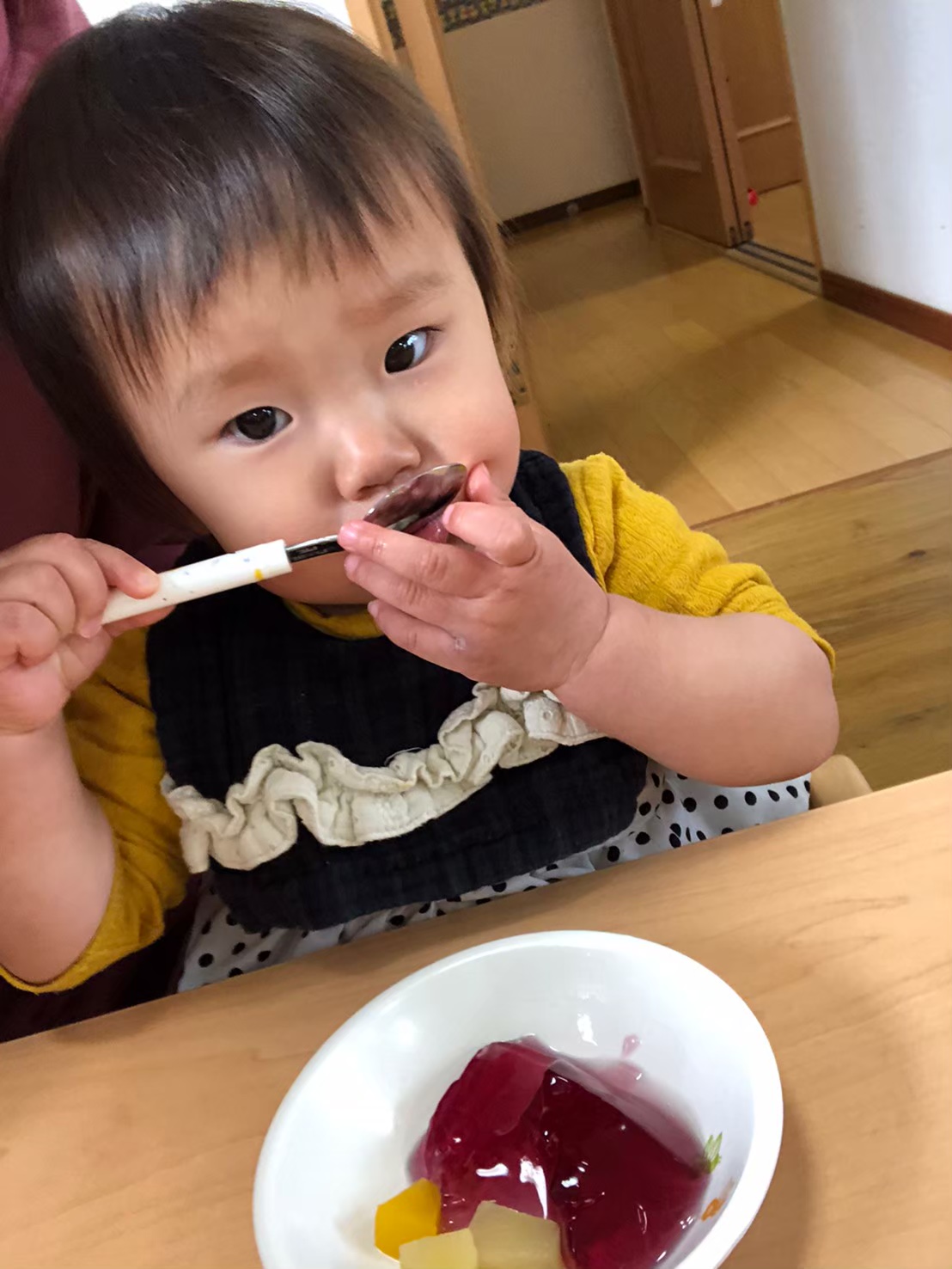 今日のおやつはゼリー。上手にすくって食べられるかな!? |